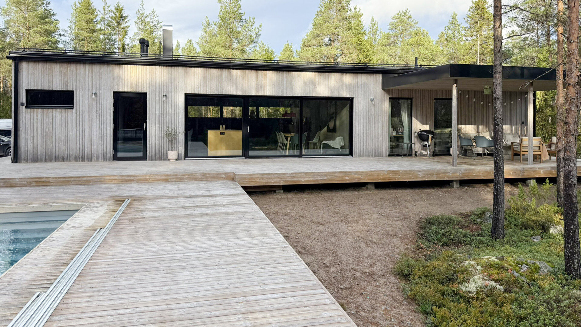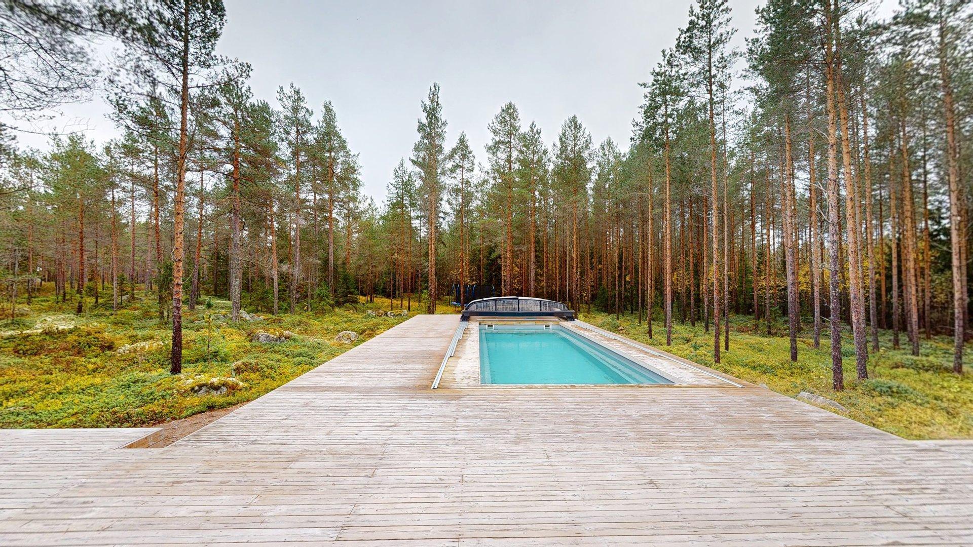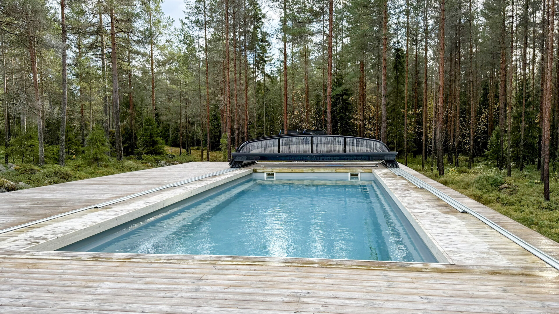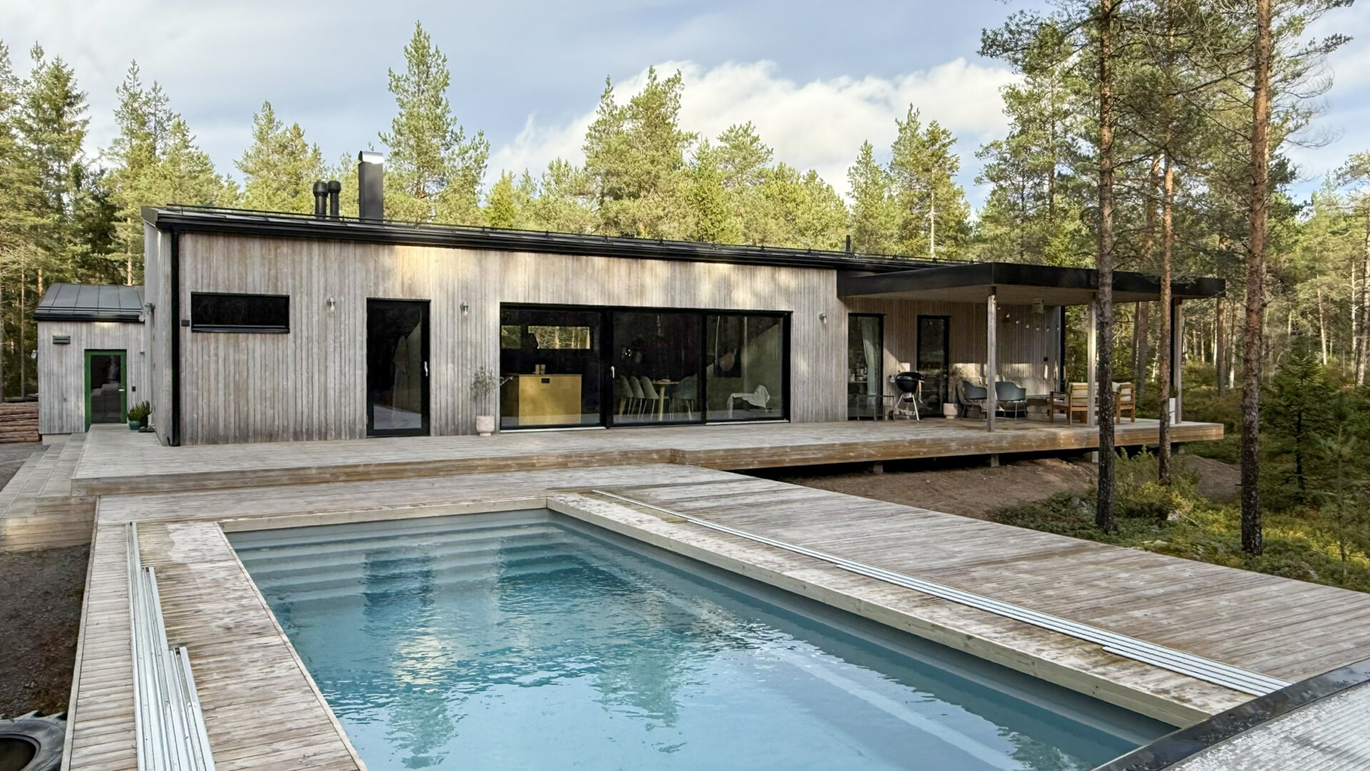 Mot söder breder ett stort terrassdäck ut sig, med gott om plats för umgänge, sol och avkoppling. Direkt från bastun når man den 8,5 x 3,5 meter stora simbassängen, perfekt för både morgondopp och sommardagar med familj och vänner.