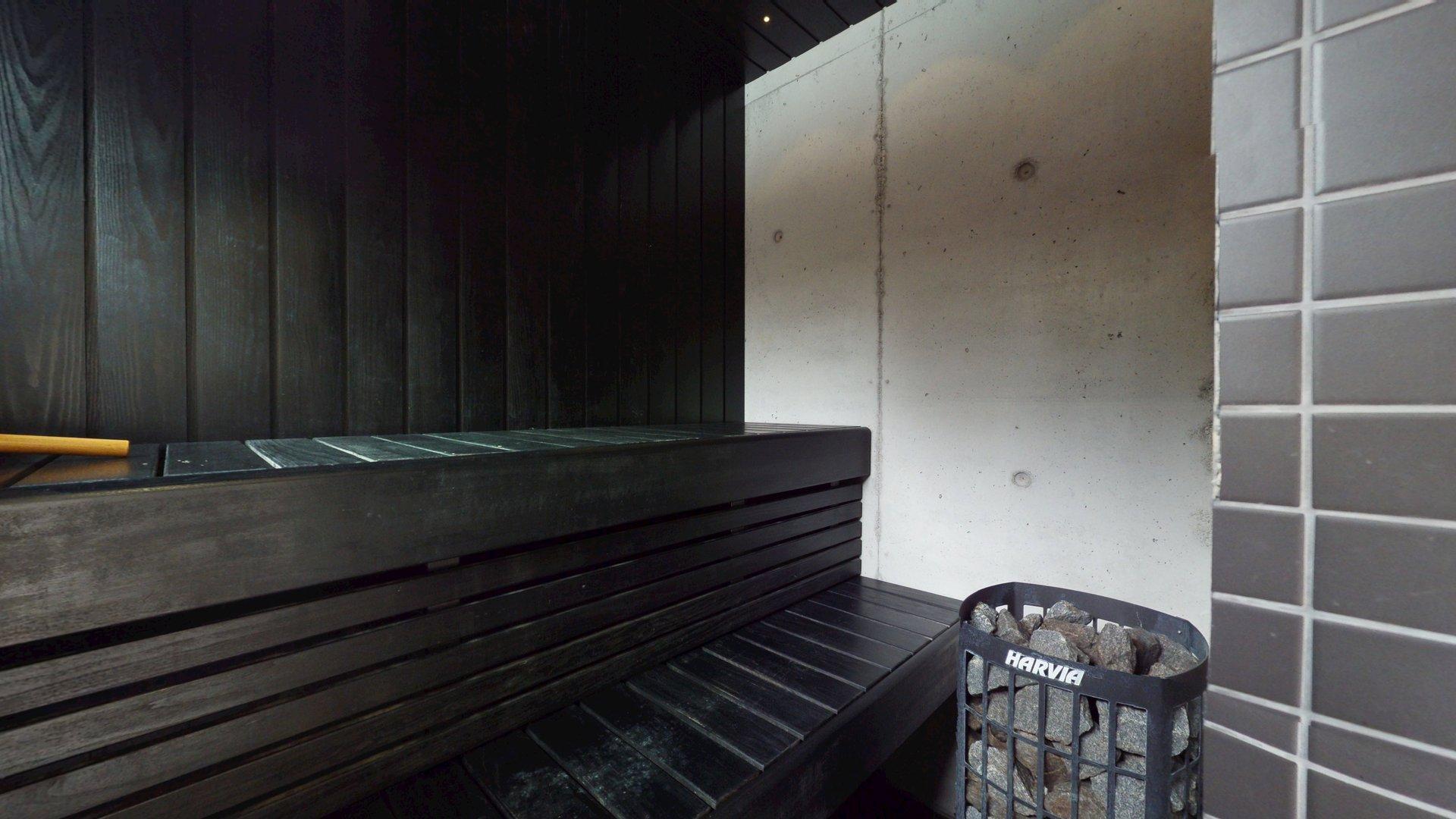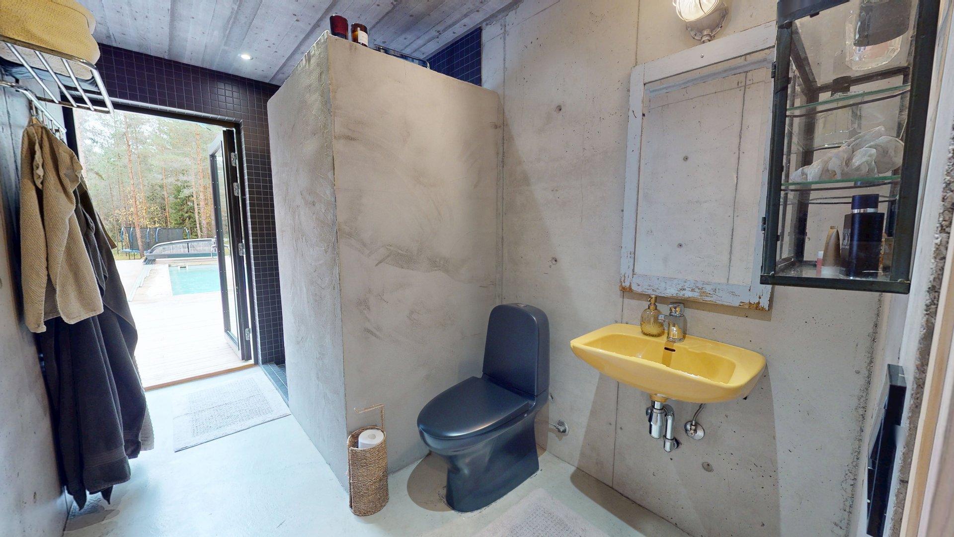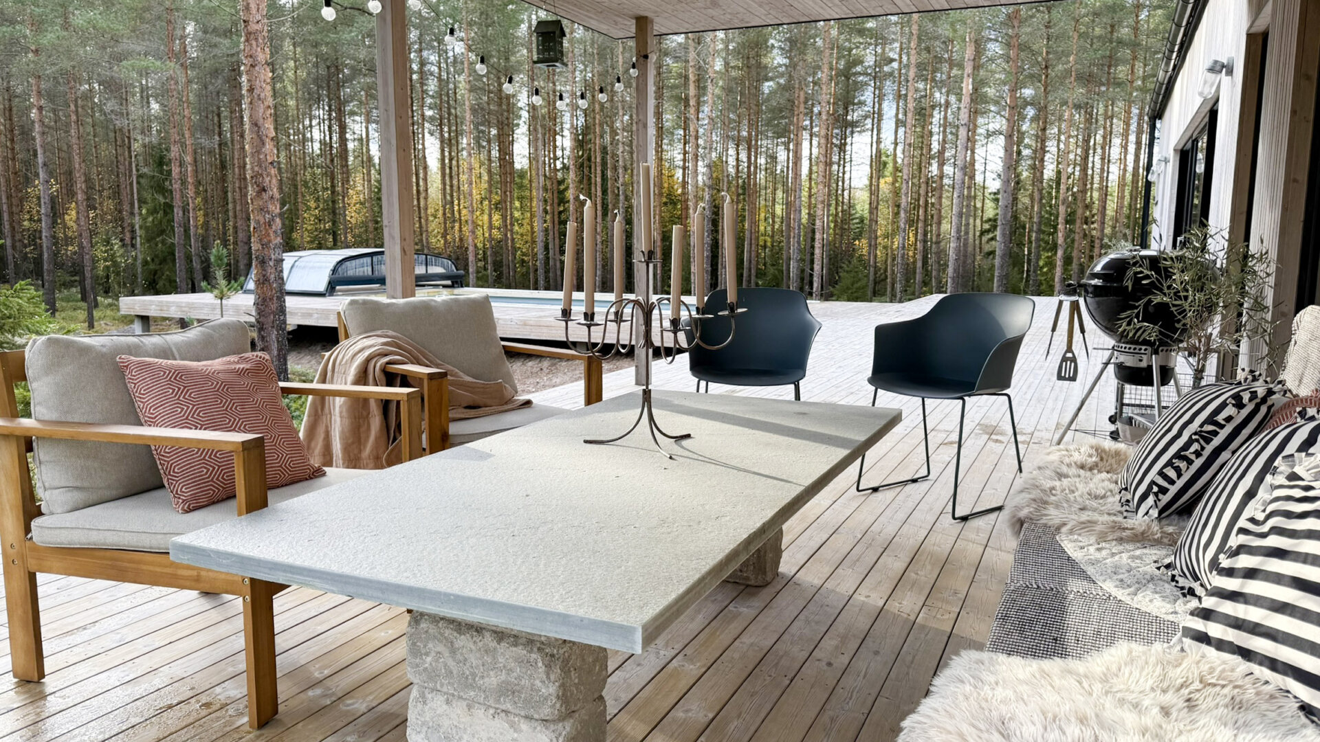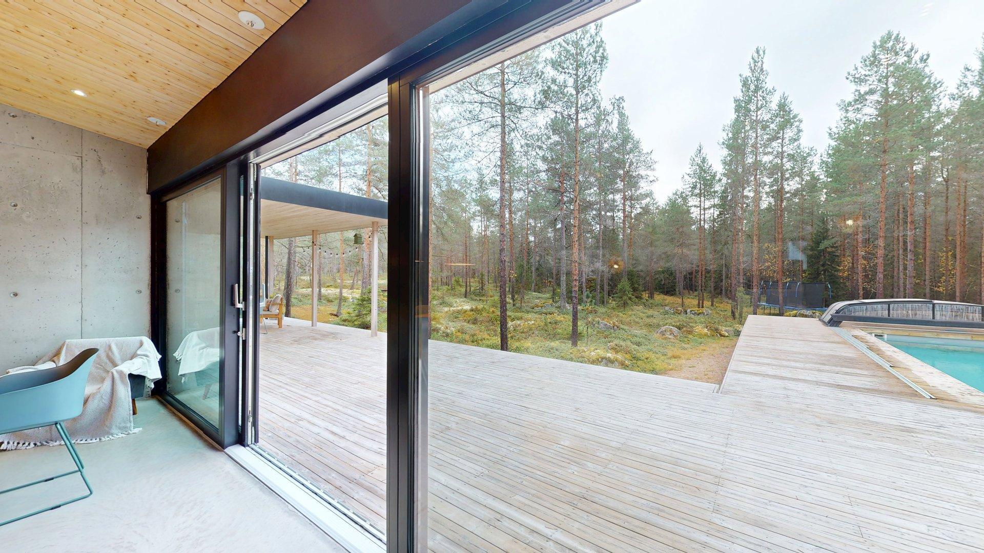 Mot söder breder ett stort terrassdäck ut sig, med gott om plats för umgänge, sol och avkoppling. Direkt från bastun når man den 8,5 x 3,5 meter stora simbassängen, perfekt för både morgondopp och sommardagar med familj och vänner.
