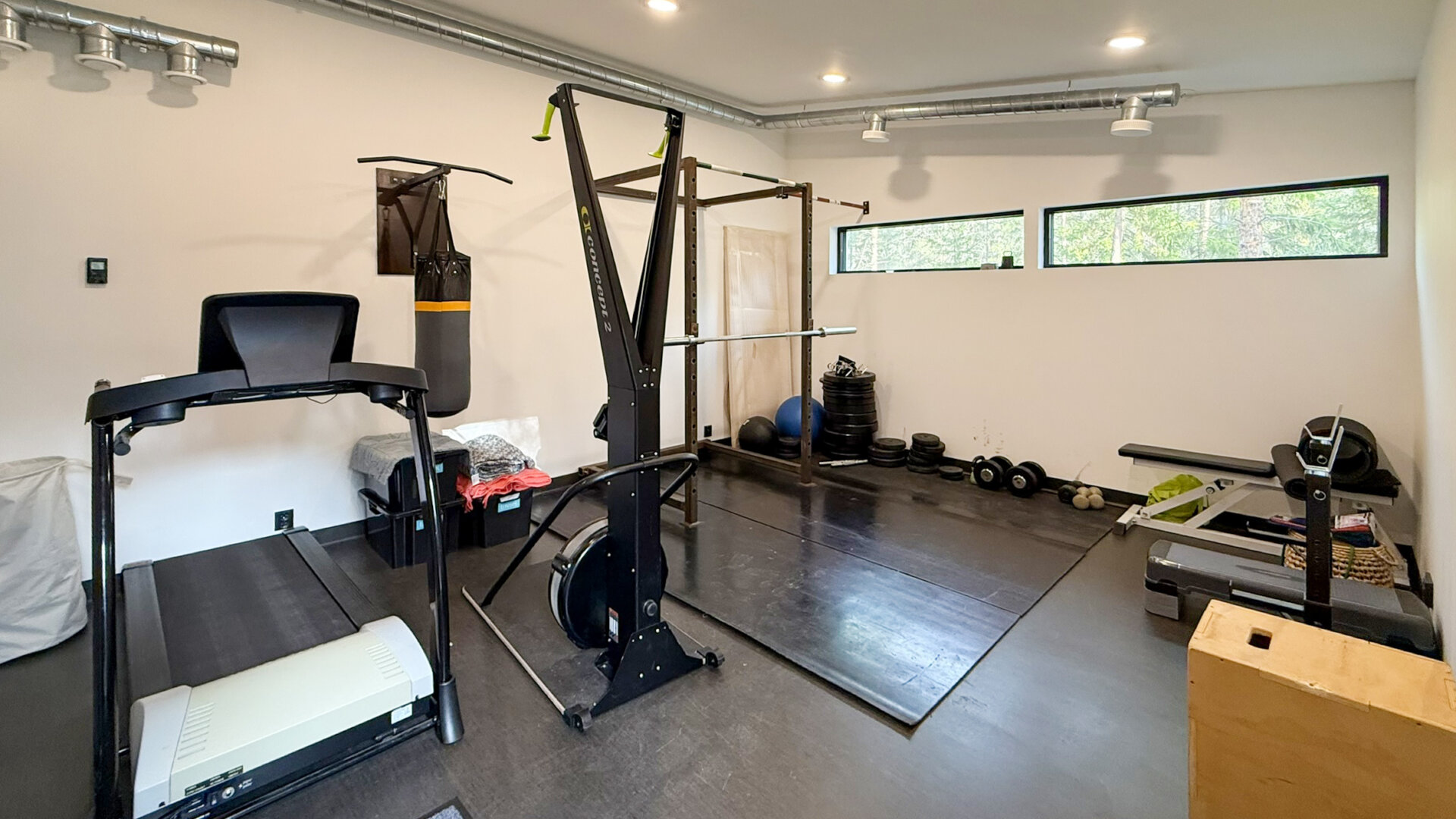 På tomten finns även en separat garagebyggnad på totalt 48 m² med garage (24 m²) och hemmagym (24 m²), där även all husteknik är samlad.